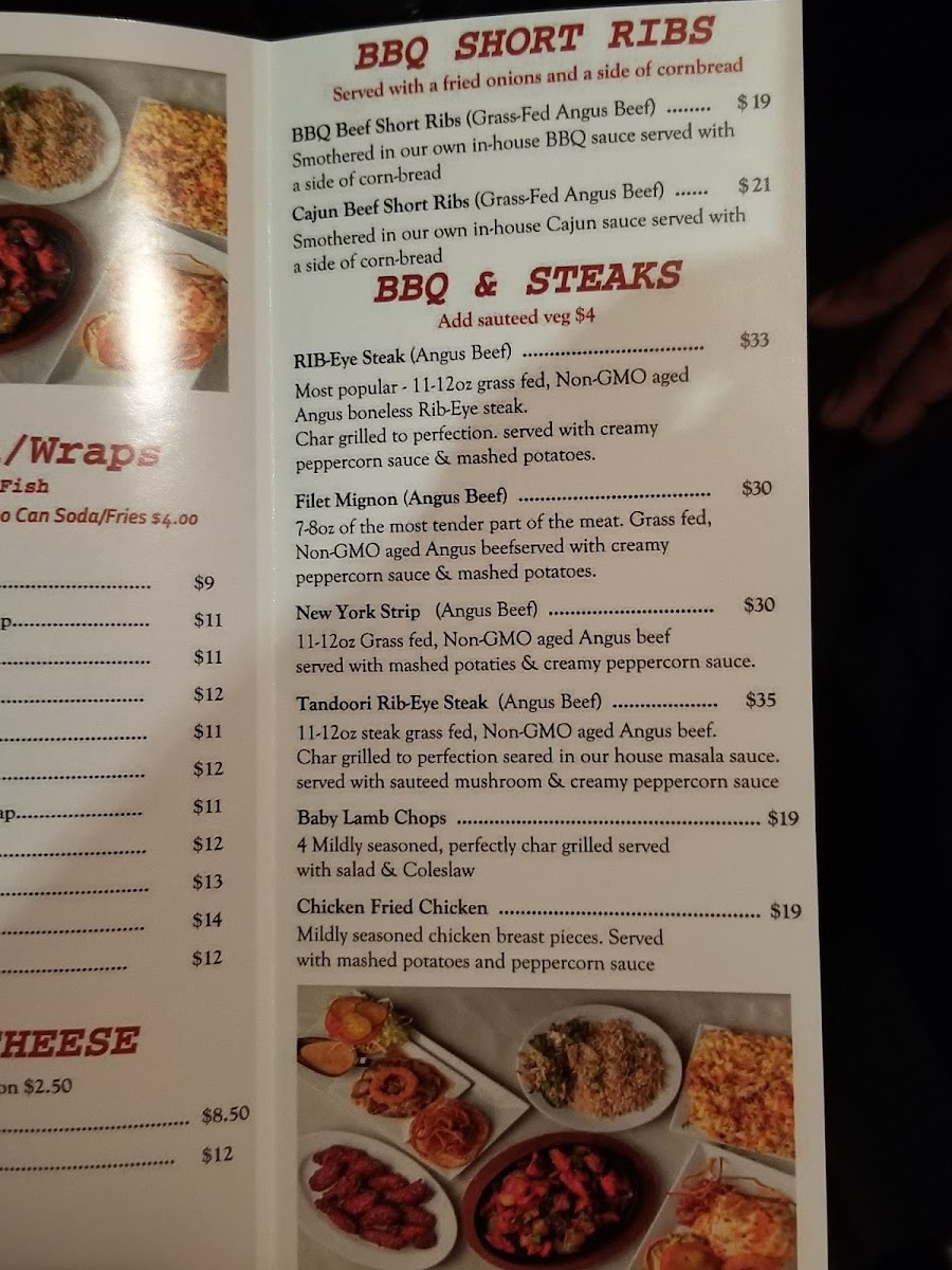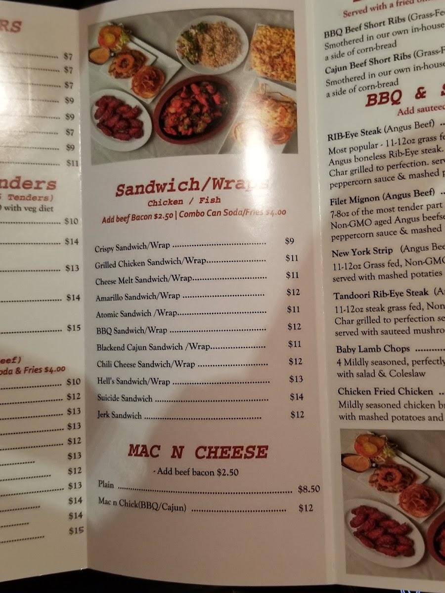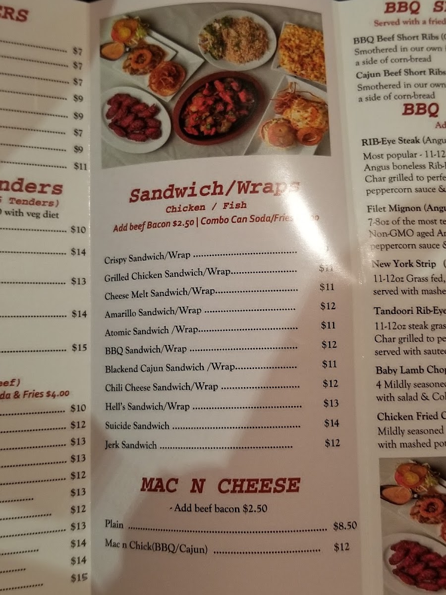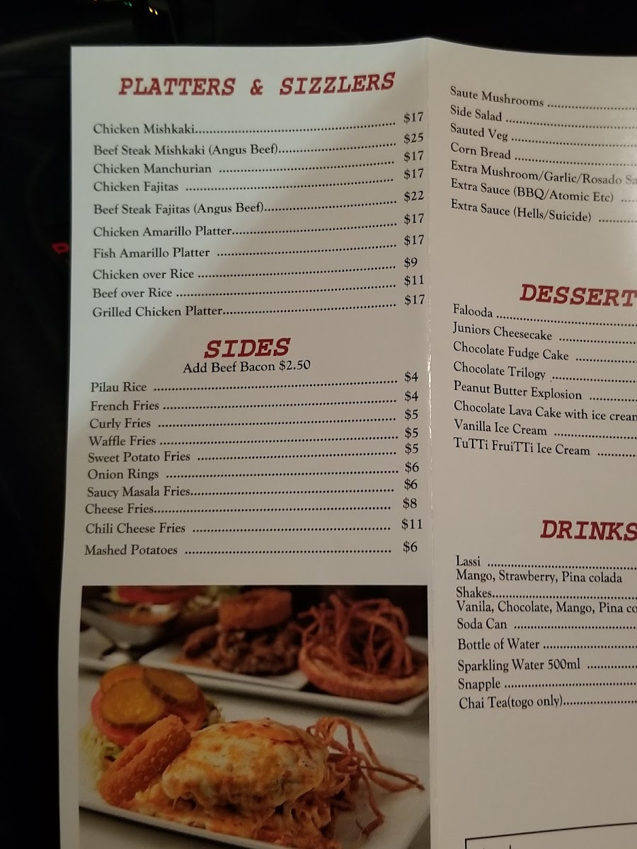 The menu highlights also include various barbecue specialties and sides such as Chicken Mishkaki, Chicken over Rice, Mac N Cheese, Filet Mignon, Cajun Chicken Sandwich, Tandoori Rib-Eye Steak Angus Beef, Bacon Cheese Fries, and several types of fries including Waffle Fries, Saucy Masala Fries, and Salted French Fries. Other noteworthy items include burgers like Suicide Burger, Amarillo Burger, Chili Cheese Burger, Beef Cheese Burger, and the Jucy Lucy Burger, as well as Baby Lamb Chops and Chicken Fajitas.